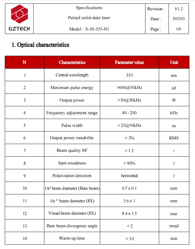 Below parameters are our 30W Solid Nanosecond UV Laser Source Datasheet.